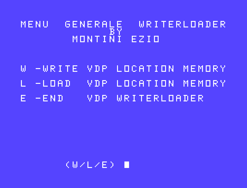 il programma VDP WRITER LOADER è uno strumento che ti permette di interagire direttamente con la memoria video del TI-99/4A, bypassando le limitazioni del BASIC e sfruttando la velocità e precisione del linguaggio macchina. Questo può essere estremamente utile nello sviluppo di software per diverse ragioni. Scritto da Ezio Montini e distribuito su cassetta venne pubblicato sulla rivista italiana TI99Newsoft nel 1985.