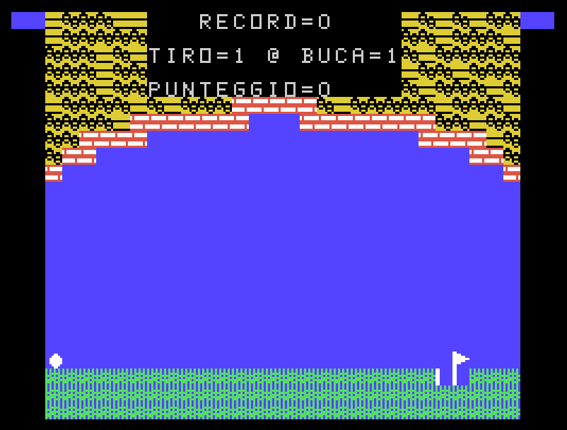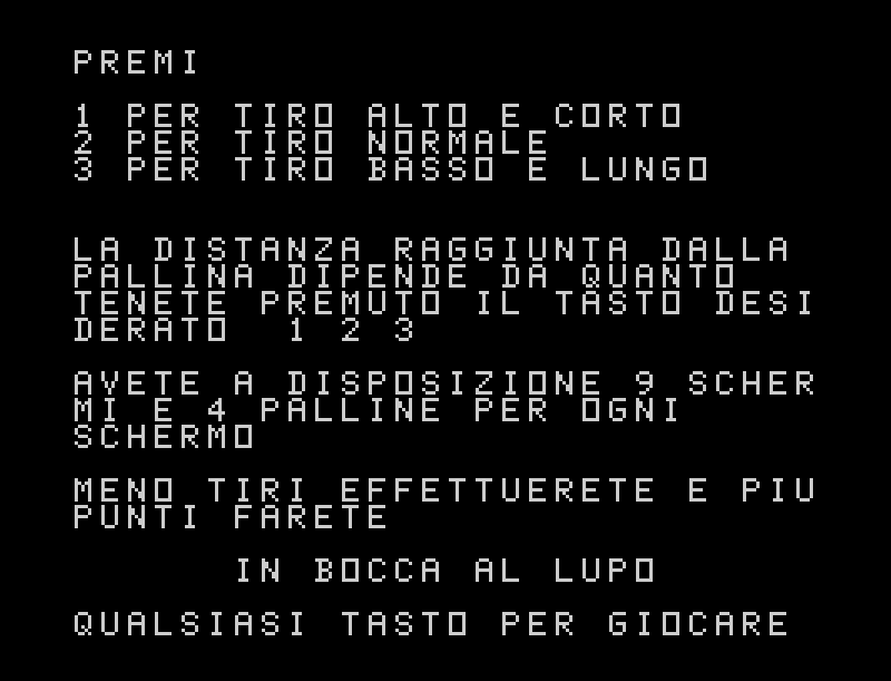 Una volta caricato e avviatoil gioco, apparirà la schermata titolo accompagnato dalle opzioni: G per giocare, I per visualizzare le istruzioni. Segliendo quest’ultima, appariranno sul video le poche regole da seguire per tentare di giungere all’ultima buca. Come vedrete, è certamente possibile, ma altrettanto certamente non facile.