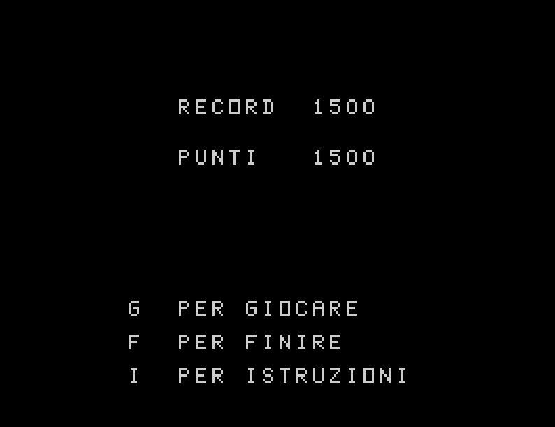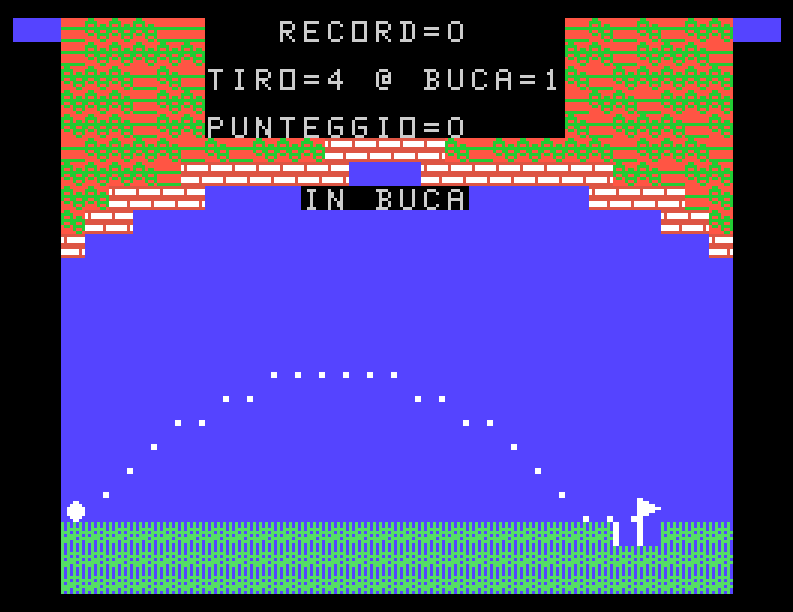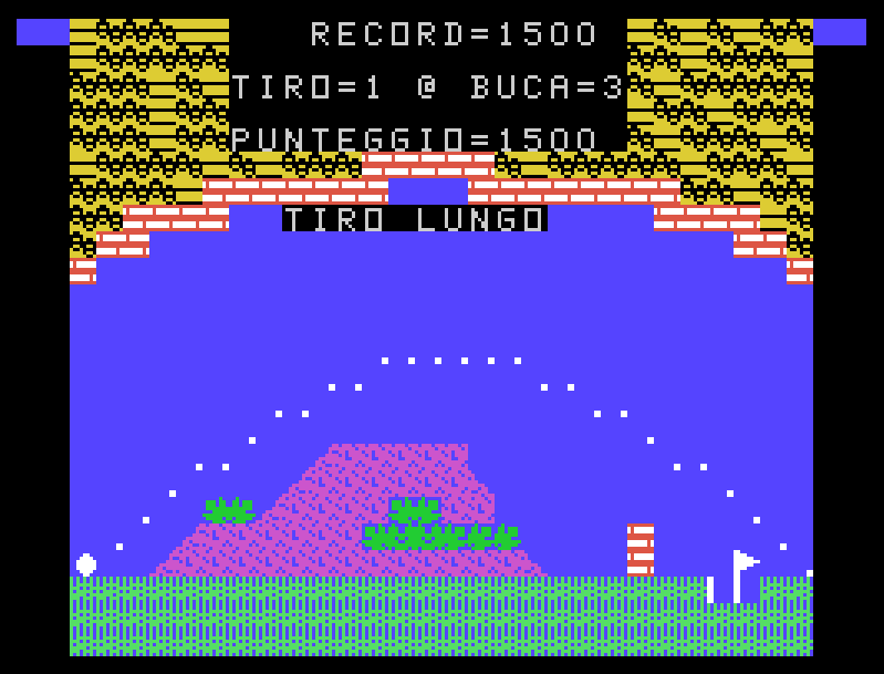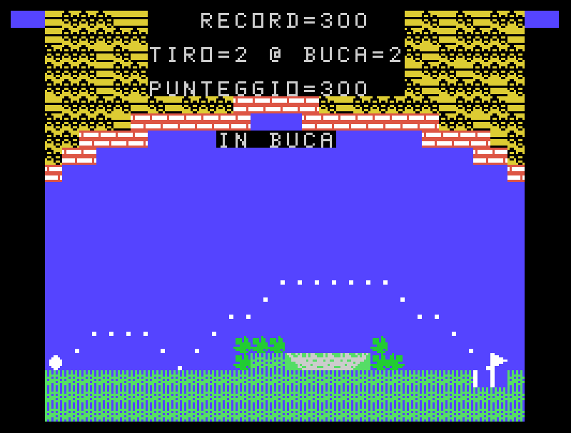 In quest’ultima evenienza, lo schermo verrà pulito e apparirà l’indicazione del record, del vostro punteggio e il menù per scegliere se continuare a giocare, terminare o visualizzare nuovamente le istruzioni. Scegliendo di giocare ancora, il gioco ricomincerà dalla buca n° 1.