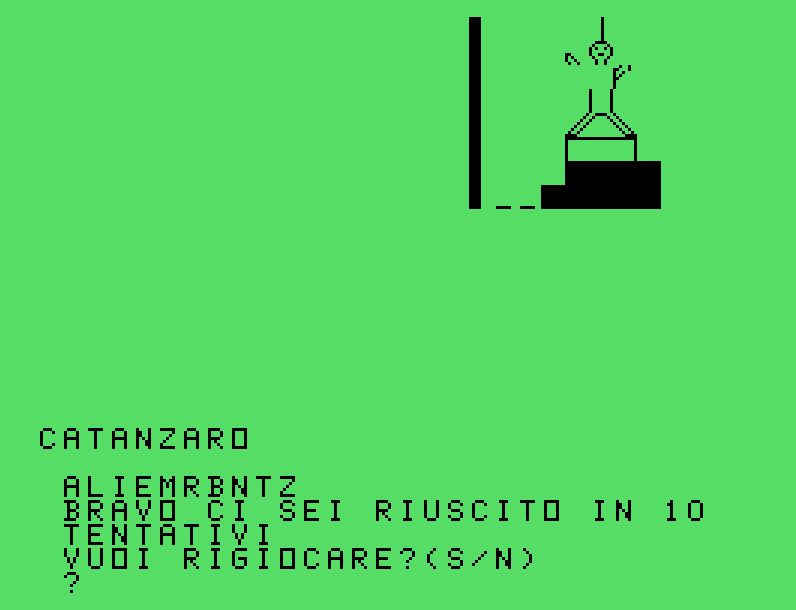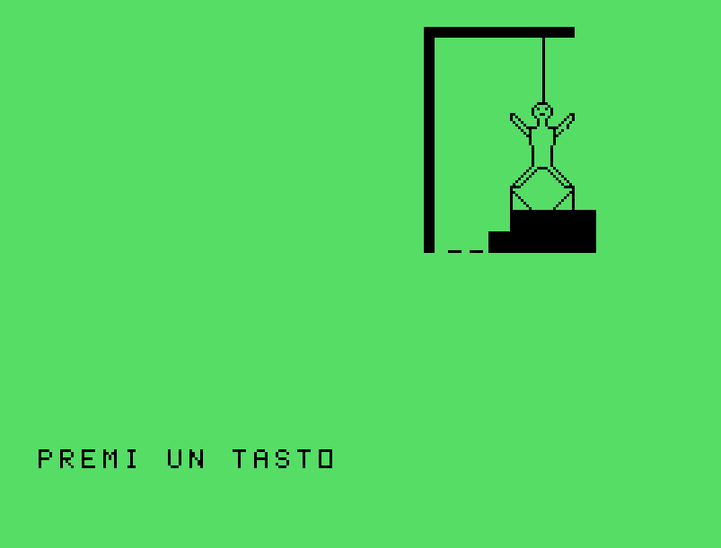 Giochi come questo dell’Impiccato è come ritrovare una cartolina ingiallita tra le pagine di un vecchio libro di scuola. Non si tratta solo di pixel e codice: è il gusto di una sfida semplice, ironica, e sorprendentemente educativa, nata per intrattenere nei pomeriggi piovosi e capace ancora oggi di divertire.Venne distribuito all’interno della cassetta allegata al numero 10 della rivista italiana TI99Newsoft, pubblicata nel 1985.