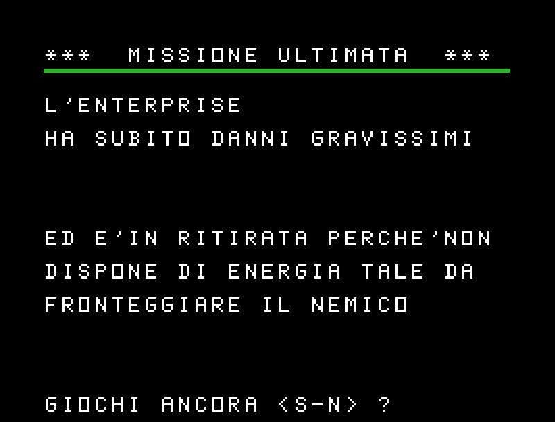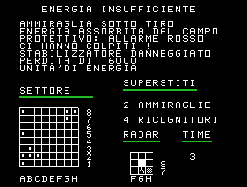 Questo gioco si propone di essere una variante del famoso gioco della Battaglia Navale però ambientata nello spazio profondo tra le astronavi di Star Trek. Dopo la schermata del titolo, premendo un tasto, il computer chiederà subito di inserire le coordinate di lancio del missile. Il campo di battaglia è un settore spaziale 8x8, ma al contrario di battaglia navale, qui ogni casella può nascondere un nemico, una zona meteoritica o il vuoto siderale. Al comando dell’astronave Enterprise, il giocatore ha un solo obiettivo: eliminare i vascelli Klingon prima che sia troppo tardi.