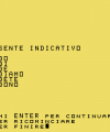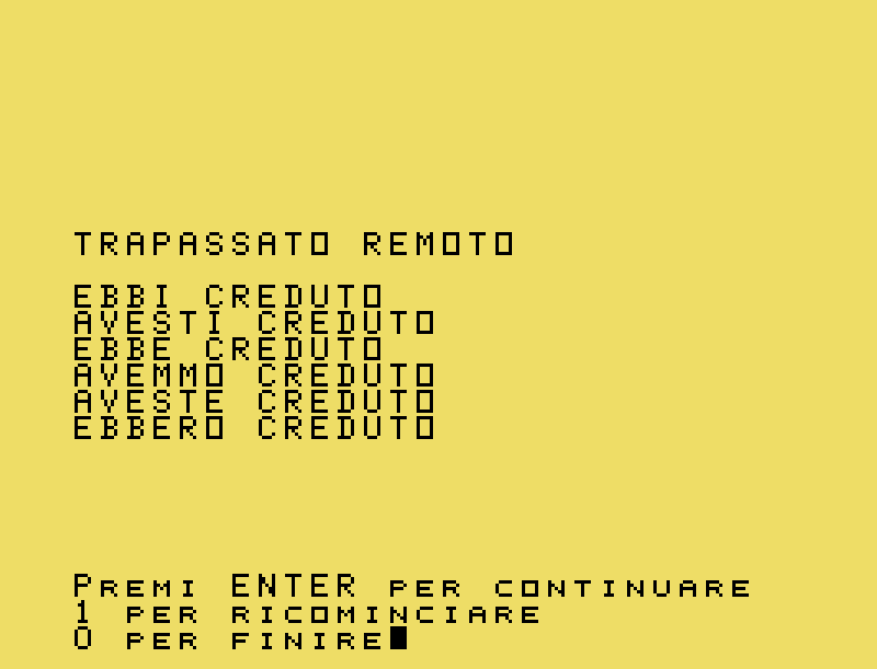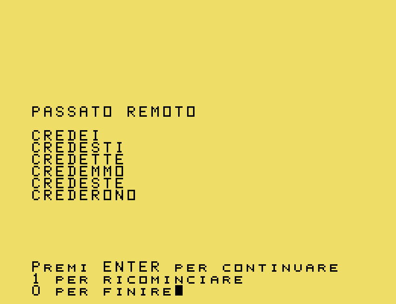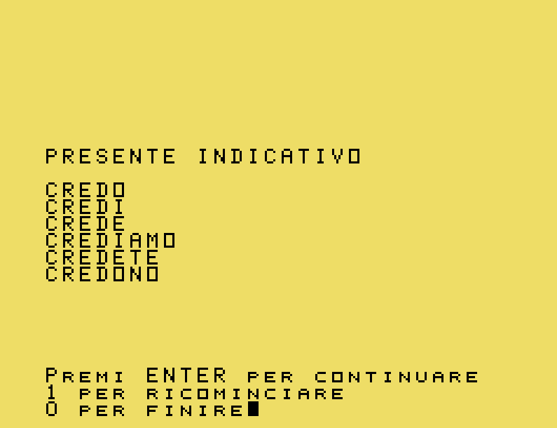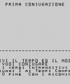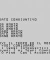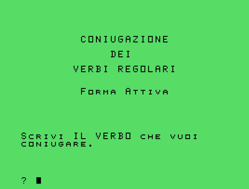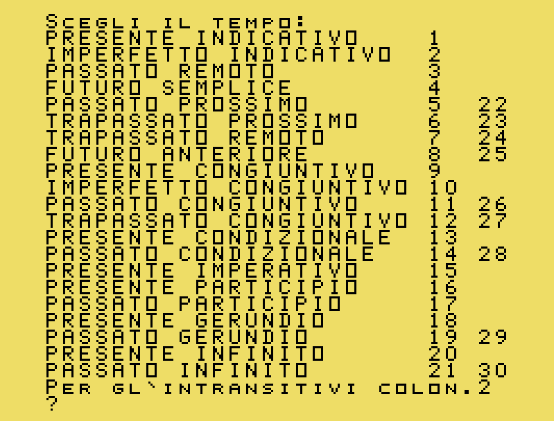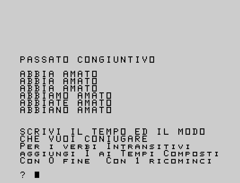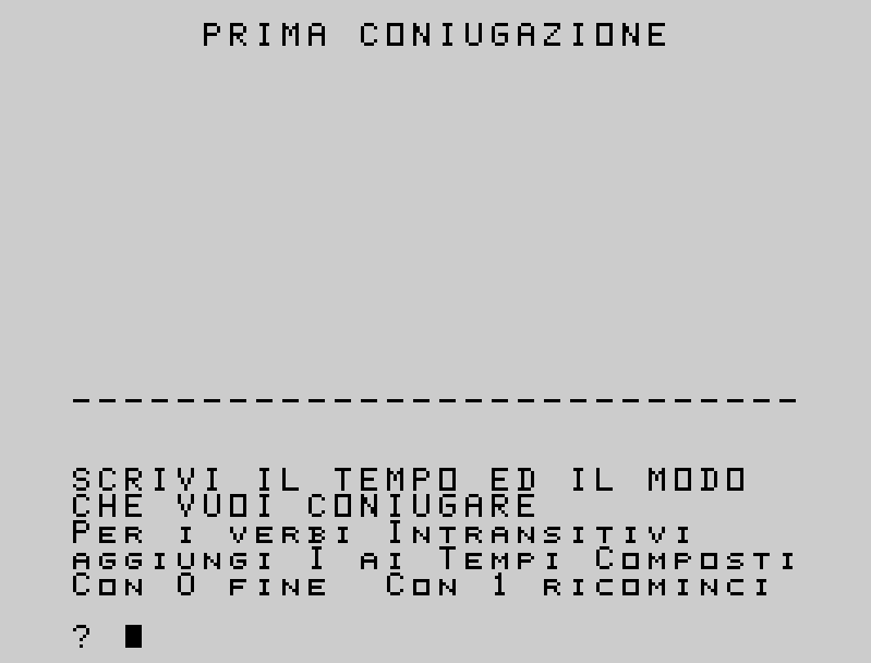 Ogni coniugazione ha il suo menù, la sua colorazione dello schermo, il suo stile di interazione. Per la prima coniugazione, l’utente deve scrivere esattamente il tempo e il modo desiderato, con l’aggiunta di una “I” per i tempi composti che richiedono l’ausiliare essere. Per le altre due, il programma presenta un menù completo, con opzioni ben visibili e distinte.