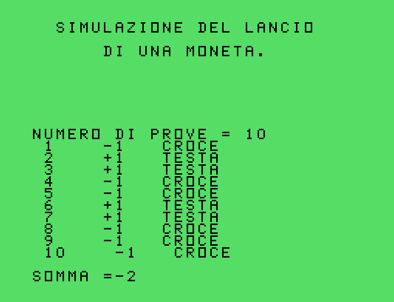 Il primo programma è una simulazione essenziale. Ogni lancio può generare solo due esiti, testa o croce, e il computer assegnerà rispettivamente +1 o 0. L’utente decide il numero di lanci, e al termine il programma calcolerà la somma algebrica dei risultati. Questa somma dovrebbe teoricamente tendere a zero, ma nella pratica può discostarsi, illustrando la differenza tra valore medio teorico ed empirico. Il programma utilizza numeri casuali reali compresi tra 0 e 2: se il numero è inferiore a 1, si considera testa; altrimenti, croce. La distribuzione è uniforme, garantendo equità statistica.