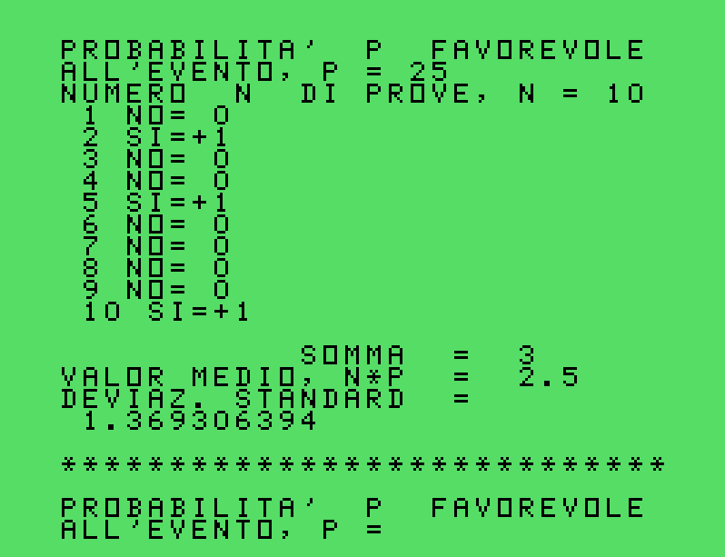 Alla fine, il programma calcolerà la somma degli 1 (cioè il numero di successi) e la confronterà con il valore medio teorico NP e la deviazione standard "Radice quadrata di NP(1-P)", come dimostrato dal matematico Jakob Bernoulli. L’accordo tra valore empirico e teorico migliora all’aumentare del numero di prove, illustrando la legge dei grandi numeri.