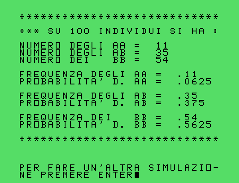 Il terzo programma entra nel cuore della genetica. Simula la trasmissione dei geni da una generazione all’altra secondo la legge di Hardy-Weinberg, che descrive l’equilibrio genetico in una popolazione ideale.