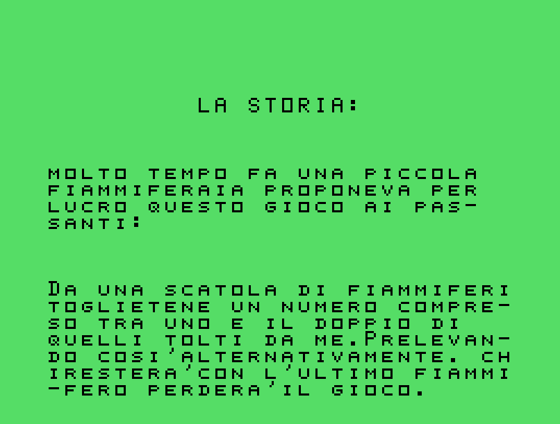 Dopo aver avviato il gioco con il fatidico "RUN", apparirà una schermata con le istruzioni preliminari che rimarrà giusto il tempo di essere letta. Il computer poi ci farà delle domande: la quantità di fiammiferi in gioco e chi sarà ad iniziare per primo.