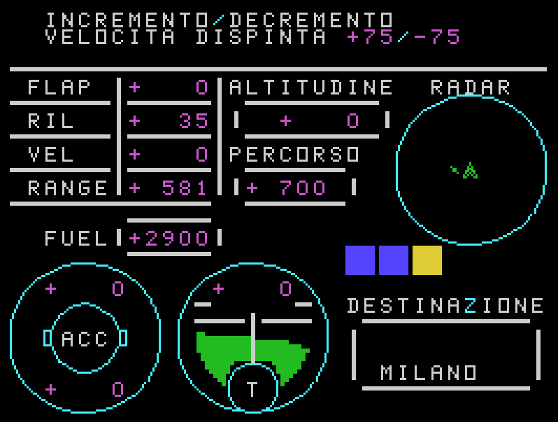 La parte superiore del cruscotto è dominata dal display del computer di bordo, che guida il giocatore passo dopo passo, chiedendo modifiche di volo o segnalando allarmi. Sotto il display, a sinistra, troviamo i FLAP, che indicano l’angolo di inclinazione dei timoni delle ali. Un’inclinazione negativa fa scendere l’aereo, una positiva lo fa salire. Ma attenzione: l’aereo reagisce con un angolo tre volte superiore a quello impostato. Per mantenere quota costante, il valore dei flap deve essere rigorosamente a zero