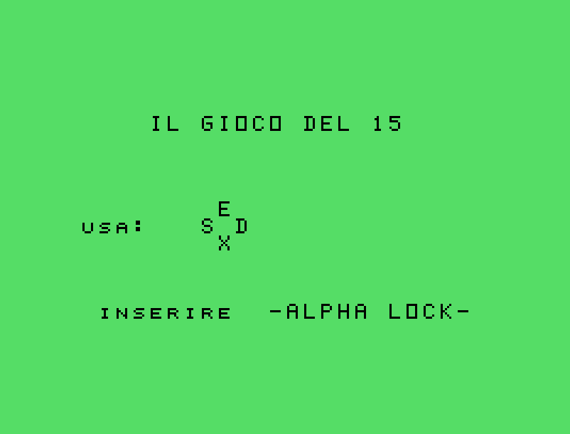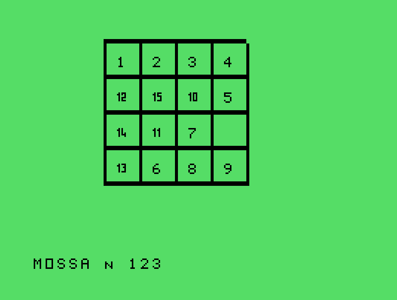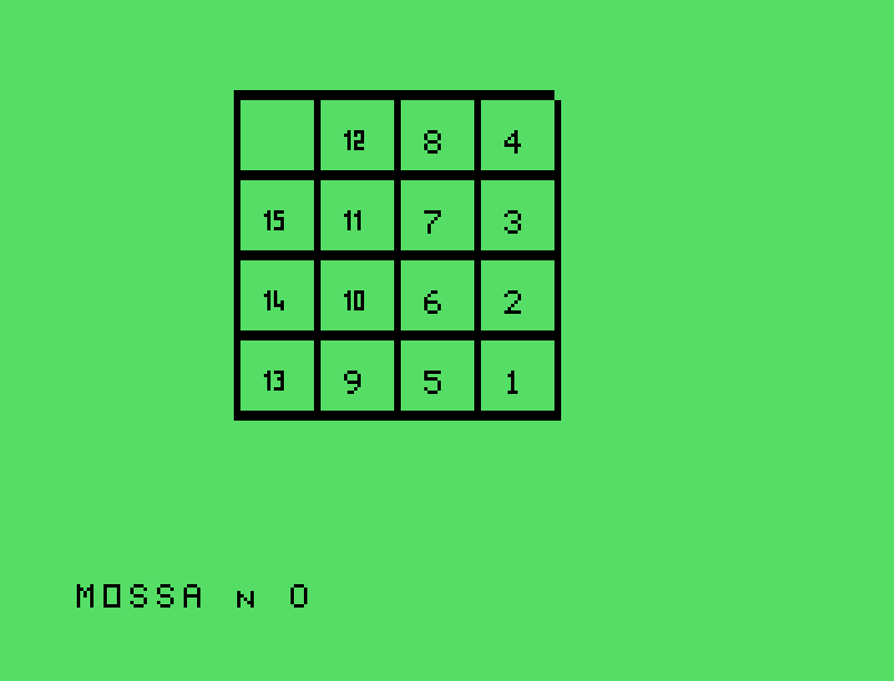 Dopo aver avviato il gioco con il fatidico "RUN", apparirà una schermata titolo con visibili i tasti da usare nel gioco poi in automatico il computer passerà alla costruzione della tabella riproducendo fedelmente la classica tavoletta numerica con sedici caselle, quindici delle quali occupate da numeri mobili disposti casualmente.