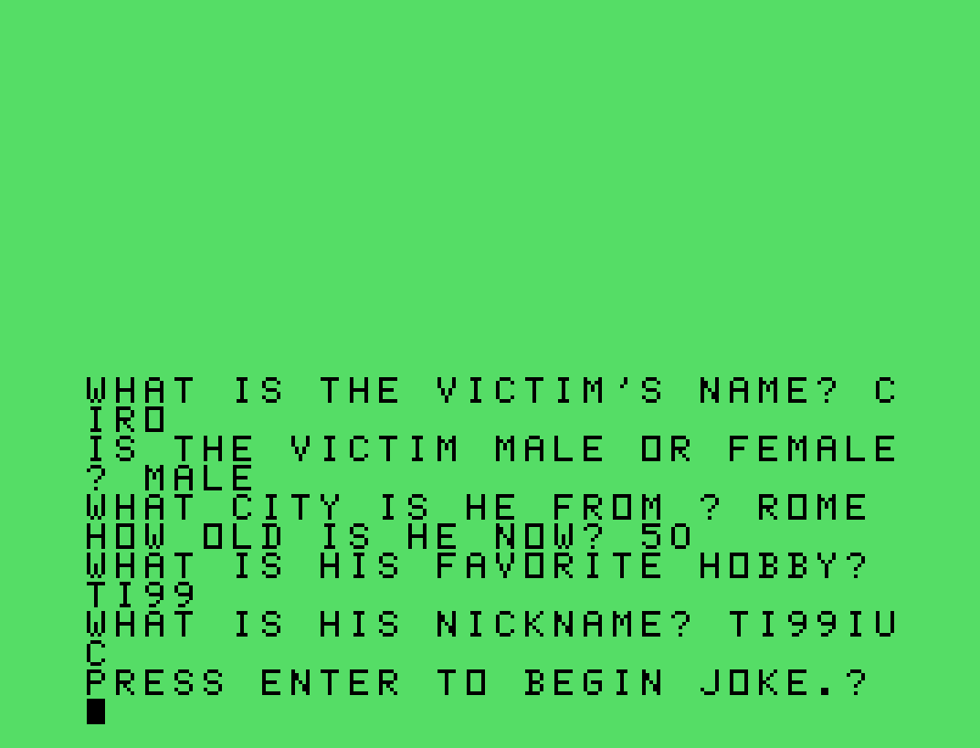 Un programma scherzoso scritto in TI BASIC per il TI-99/4A. Non ha finalità didattiche nel senso stretto di insegnare il linguaggio. Tuttavia, il codice di questo programmino può essere utile per familiarizzare con alcune funzioni base del TI BASIC, come CALL CLEAR, PRINT, INPUT, FOR...NEXT, IF...THEN...ELSE, GOSUB, e l'uso di variabili stringa e numeriche.