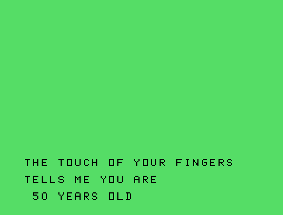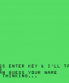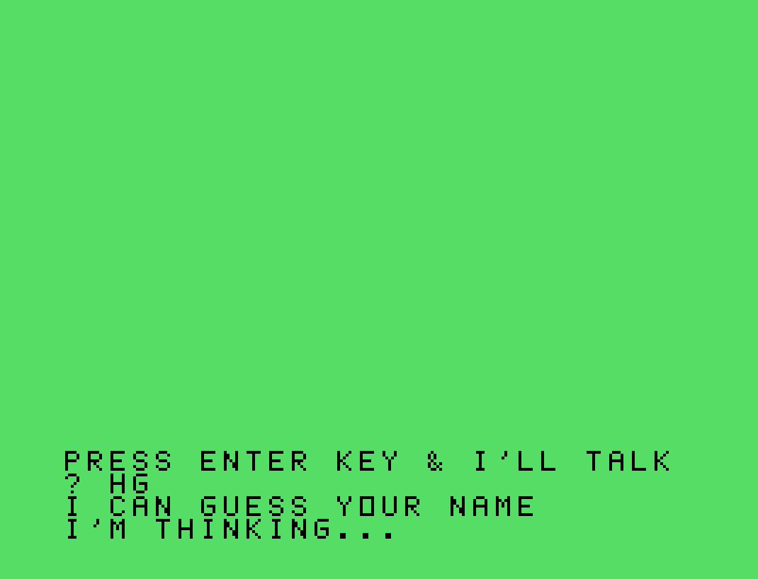 Dopo aver avviato il programma con il comando "RUN", appare una semplice schermata del titolo e subito il computer inizierà con le domande di cui necessita risposta: nome, genere, città, età, hobby, soprannome. Questi vengono poi riutilizzati in una sequenza di output teatrali, intervallati da pause e pulizia dello schermo, per creare l’illusione di un sistema “intelligente” che sta elaborando e deducendo le informazioni.