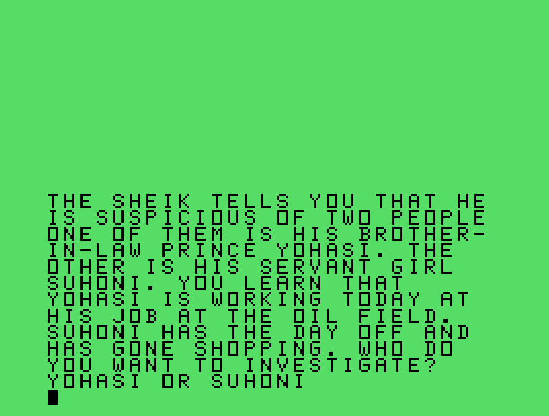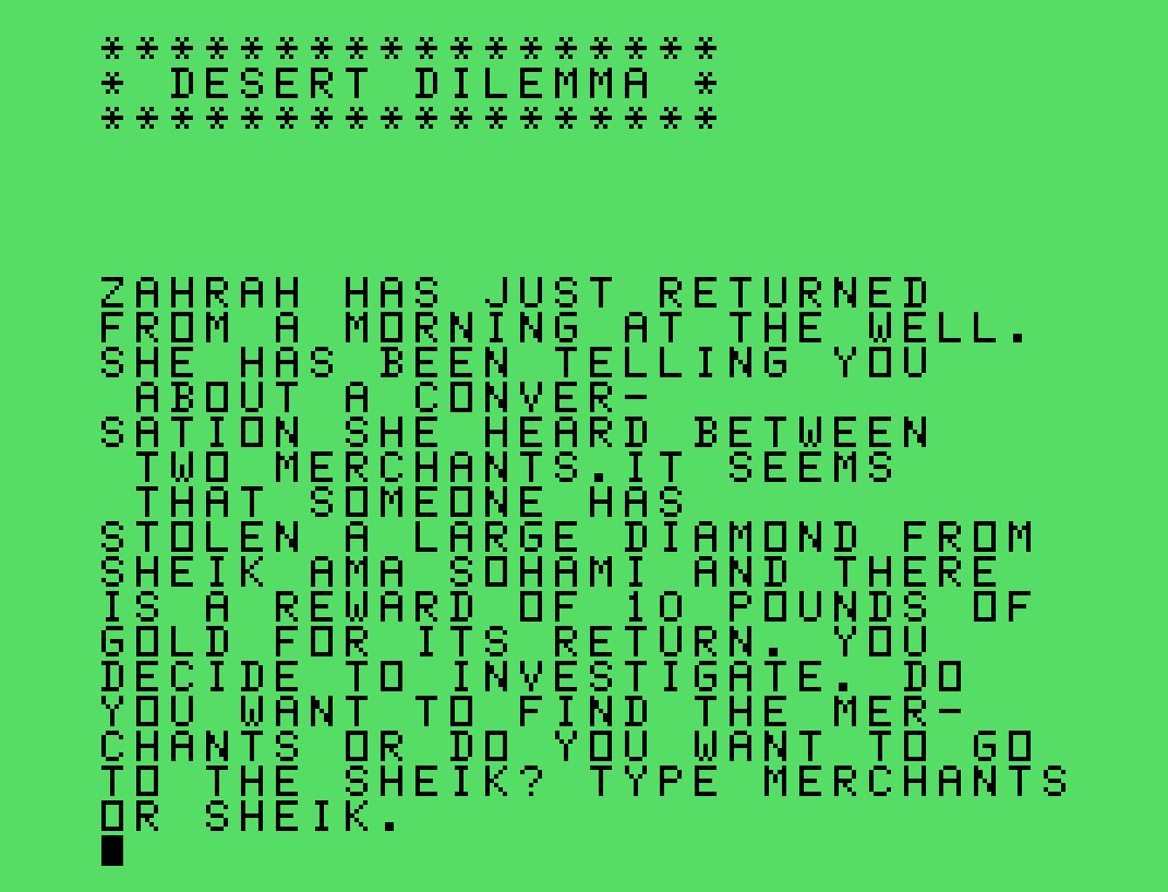 Questo è un gioco d’avventura testuale che si distinse nel panorama ludico del TI-99/4A per via della sua struttura a bivi, la profondità narrativa e l’intento didattico. Desert Dilemma venne sviluppato da James Schwartz, e fu pubblicato sulla rivista americana 99er Home Computer Magazine nell’Ottobre 1983.