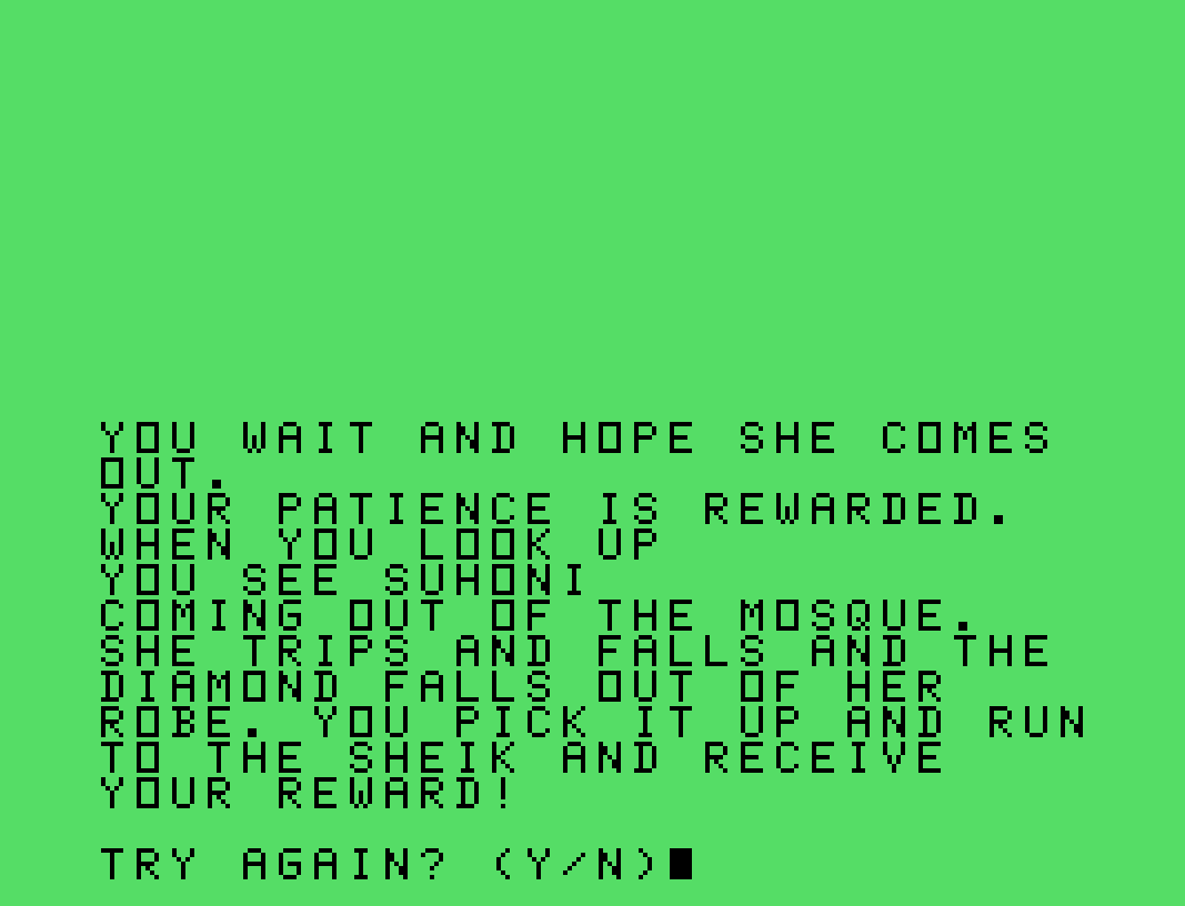 Il gioco è in realtà in una veste di insegnante per fare in modo che altri utenti apprendano la metodologia per potersi creare in autonomia dei giochi di avventura testuali. Desert Dilemma è comunque un gioco finito che offre un esempio concreto con un framework narrativo riutilizzabile. Il protagonista è coinvolto in un mistero nel deserto: qualcuno ha rubato un prezioso diamante allo sceicco, e c’è una ricompensa per chi lo riporta. Il giocatore deve scegliere se indagare parlando con lo sceicco o cercando i mercanti, e da lì si diramano numerosi percorsi alternativi.