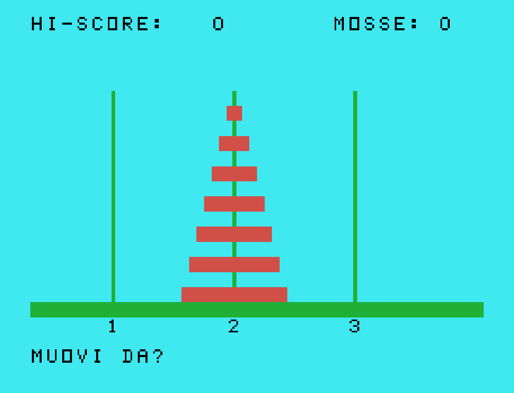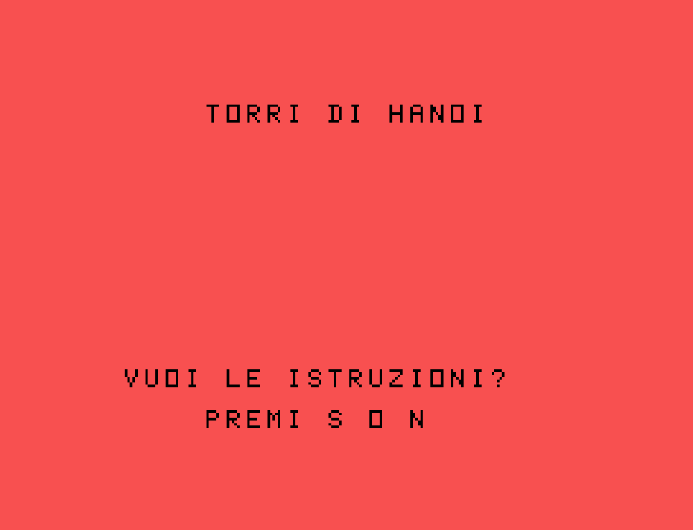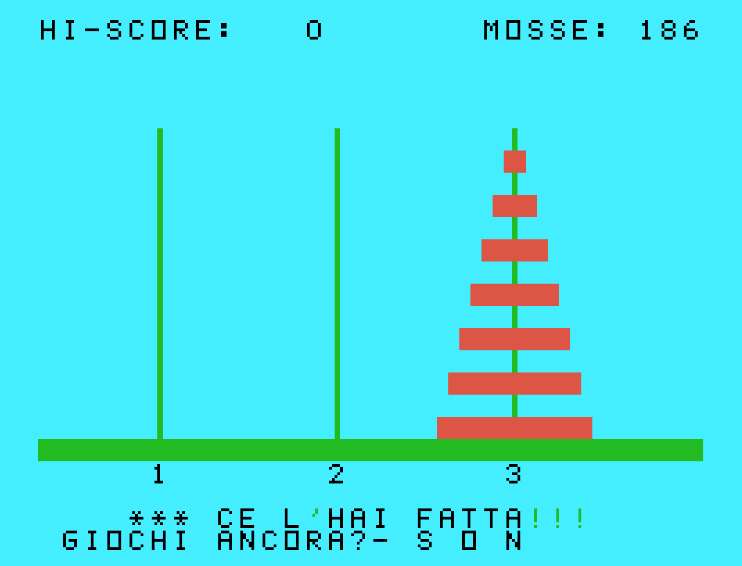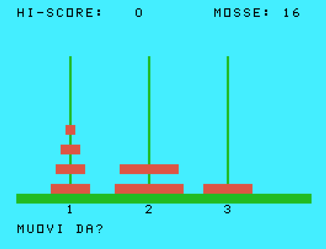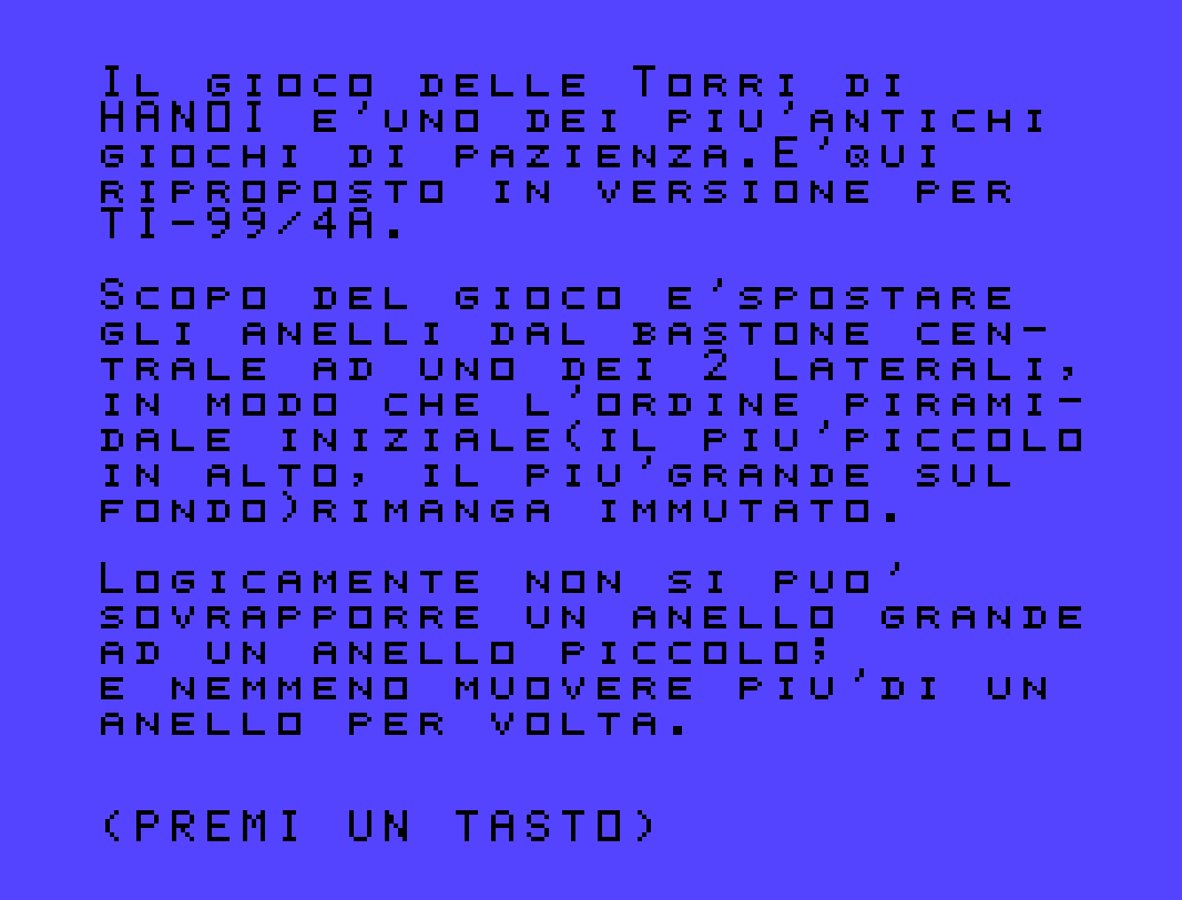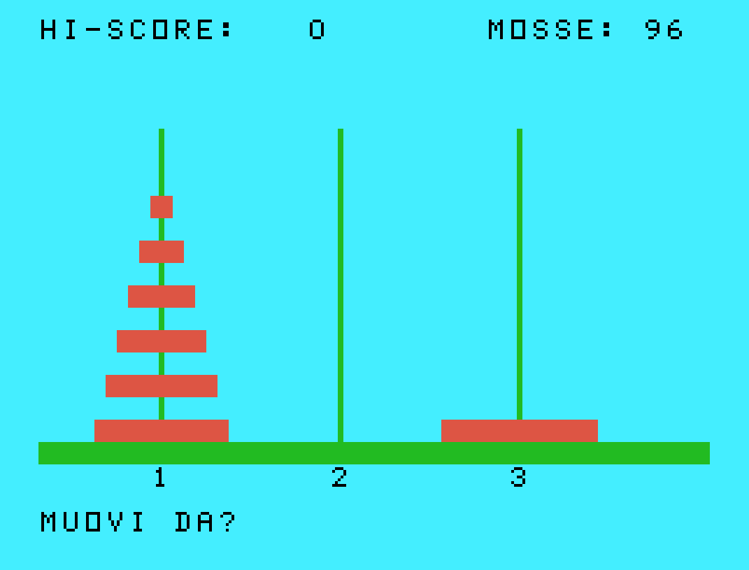 Ecco un gioco non solo divertente da giocare, ma anche una dimostrazione delle potenzialità del TI BASIC. Il gioco Le Torri di Hanoi è la versione italiana tradotta e adattata del titolo originale TI Tower di J.R. Herold, pubblicato nel 1983 sulla rivista americana Compute! n.40. La traduzione italiana è stata curata da E. Re Garbagnati e pubblicata su Papersoft nel 1984.