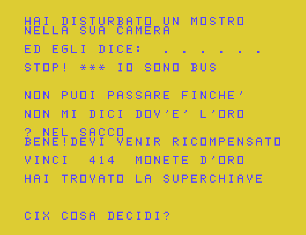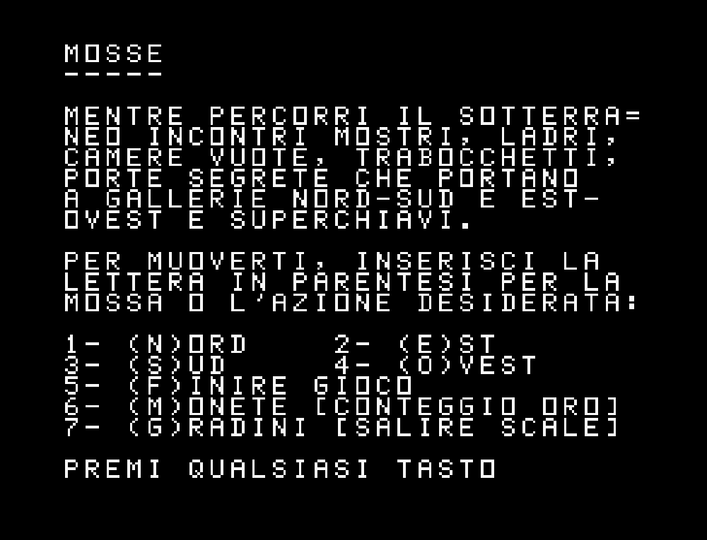 Dopo aver caricato il Programma 1, riceverete le istruzioni per affrontare il sotterraneo. Vi verranno assegnate 1.000 monete d’oro e sarete trasportati al livello inferiore del labirinto. Ogni stanza può nascondere una sorpresa: una domanda da un mostro, un ladro pronto a derubarvi, una trappola o una porta segreta.