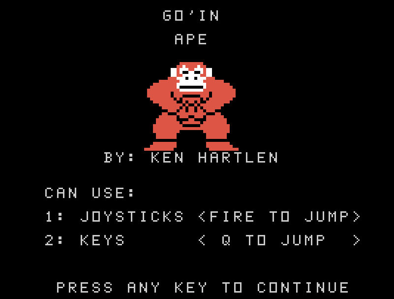 Un gioco carino trovato nella libreria dei giochi catalogati da alcuni floppy disk. Creato nell'era dove il famoso Donkey Kong la faceva da padrone, Go'in Ape, ne riprende lo stile e la storia. Scritto in Extended BASIC da Ken Hartlen sfrutta molto bene le potenzialità del TI-99/4A.