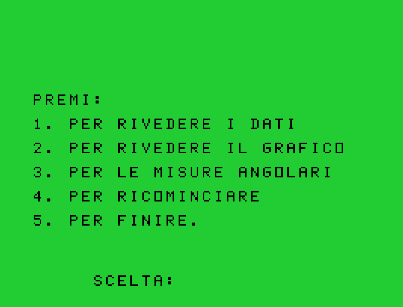 Un’altra limitazione riguarda i colori. Sebbene il TI-99/4A supporti 16 colori, ogni carattere può visualizzarne solo due (foreground e background). Questo rende impossibile distinguere più di due settori convergenti nello stesso carattere. Il programma opta quindi per una rappresentazione monocromatica, ma precisa.