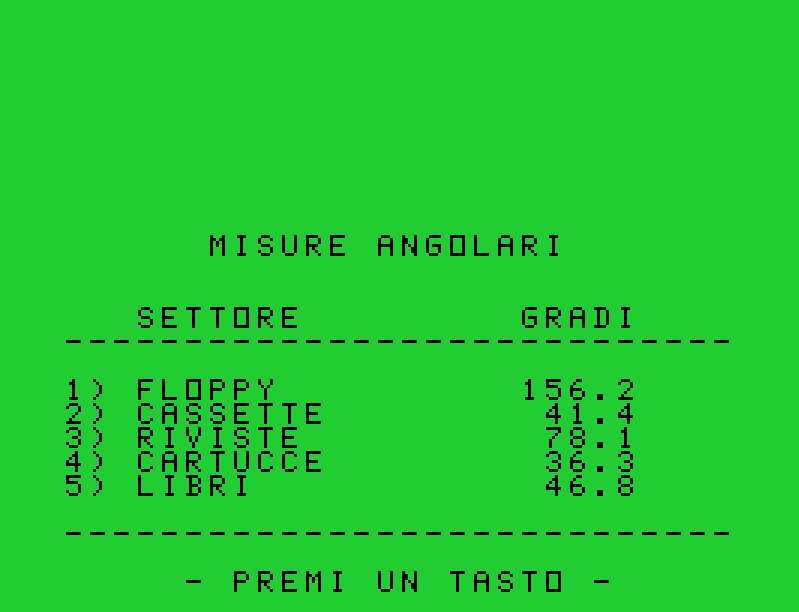 Il programma calcola le percentuali, le tabula e genera il diagramma a torta. Se si dovesse commettere un errore di inserimento questo si potrà correggere nel menu contestuale relativo. Dopo la conferma, si accederà a un menu che permette di visualizzare la tabella, il grafico o una sezione con gli angoli in gradi decimali di ciascun settore, utile per chi volesse riprodurre il diagramma manualmente con riga e compasso.