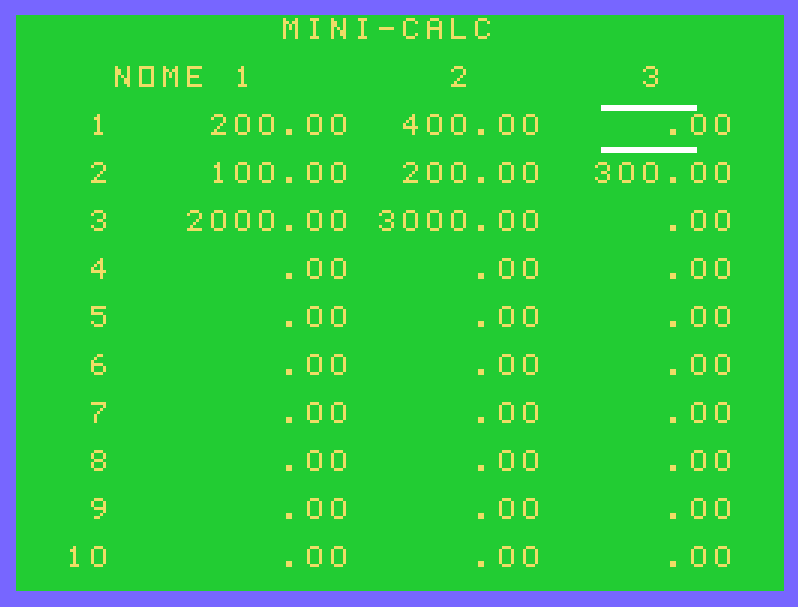 Tramite le frecce direzionali ci si potrà spostare con il cursore per inserire i dati numerici desiderati, con una lunghezza massima di sette caratteri (incluso il punto decimale). Ogni volta che si lascerà una cella, i dati verranno memorizzati e restando disponibili finché il computer rimarrà acceso; possono anche essere salvati su disco o cassetta.