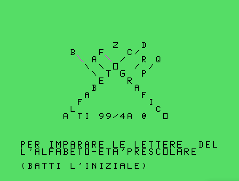 La grafice e i colori hanno sempre attratto grandi ma soprattutto i piccoli! L'ìidea dello sviluppatore Sergio Perrone è stata proprio quella di realizzare un software didattico concepito per l’apprendimento precoce. Alfabeto Grafico (ALBUM) per il TI-99/4A in configurazione base, vuole offrire ai bambini in età prescolare uno strumento interattivo per familiarizzare con le lettere dell’alfabeto italiano. Venne pubblicato sulla rivista italiana TI99Newsoft di Gennaio 1985.