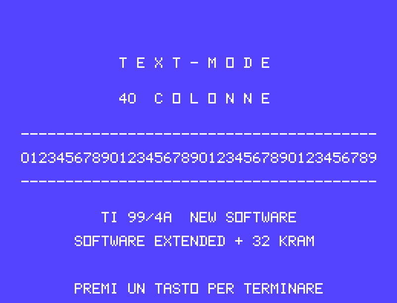 Il programma che presentiamo aggiunge tre istruzioni al normale Extended Basic, permettendo l’utilizzo del text mode, una modalità video che consente di visualizzare 40 colonne anziché le consuete 32. Sebbene questa modalità presenti alcune limitazioni (come l’impossibilità di usare sprite o modificare il colore dei caratteri) è stata concepita principalmente per l’elaborazione di testi, da cui il nome.