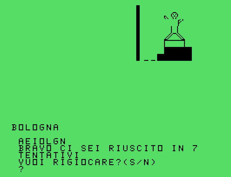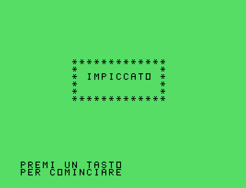 Giochi come questo dell’Impiccato è come ritrovare una cartolina ingiallita tra le pagine di un vecchio libro di scuola. Non si tratta solo di pixel e codice: è il gusto di una sfida semplice, ironica, e sorprendentemente educativa, nata per intrattenere nei pomeriggi piovosi e capace ancora oggi di divertire.Venne distribuito all’interno della cassetta allegata al numero 10 della rivista italiana TI99Newsoft, pubblicata nel 1985.