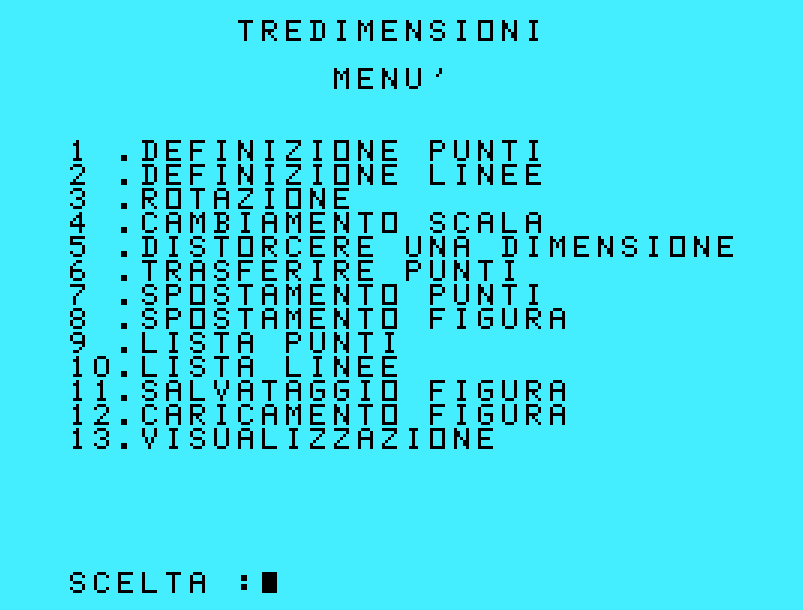 12. Caricamento da cassetta: Permette di caricare in memoria una figura precedentemente salvata. Nella cassetta allegata è incluso un esempio già pronto: un parallelepipedo che può essere visualizzato con l’opzione successiva.