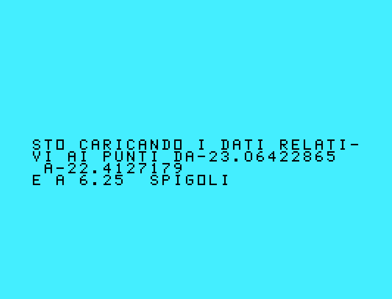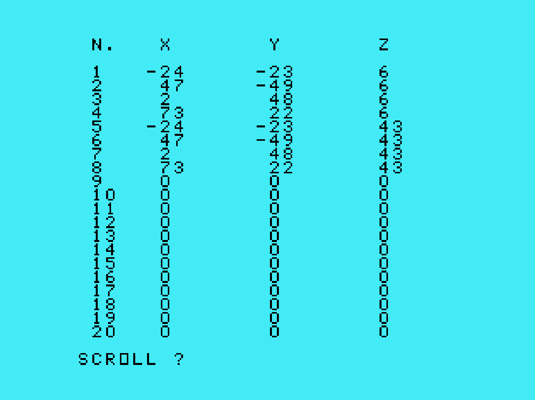 A corredo del programma, nella cassetta fornita è incluso un esempio già pronto da caricare con l’opzione 12. Si tratta di un parallelepipedo definito nei suoi vertici e spigoli, che può essere visualizzato immediatamente usando l’opzione 13. Per ottenere una resa prospettica efficace, l’autore consiglia di impostare la distanza del punto di fuga a 200 e l’altezza dell’osservatore a 30.