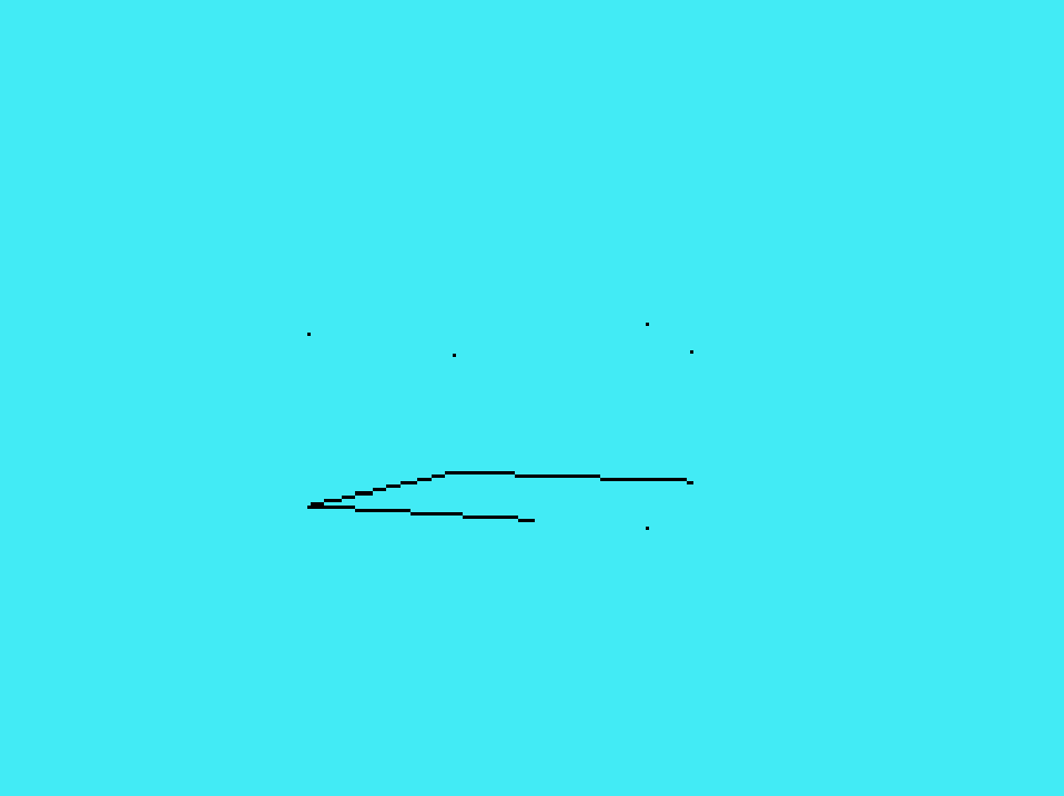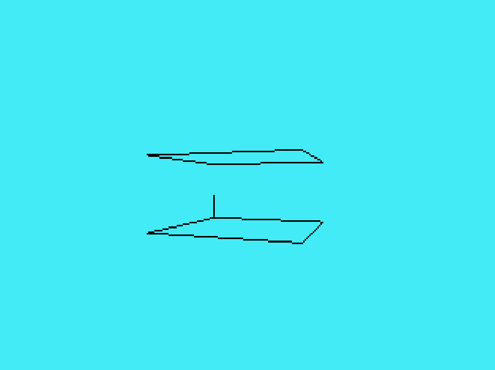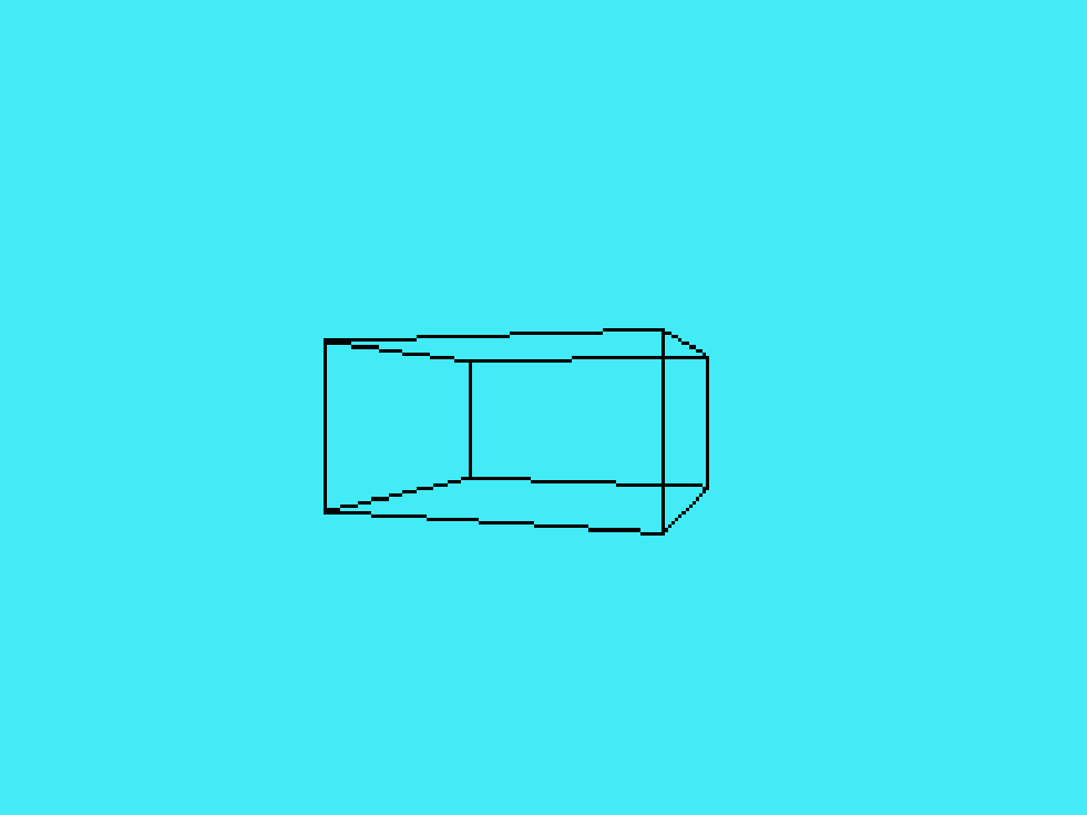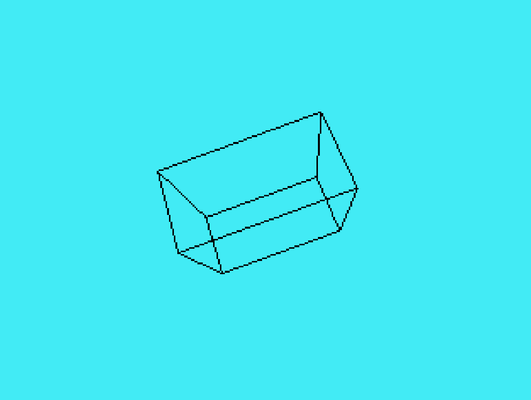 Questi valori permettono di apprezzare la figura con una prospettiva ben marcata: il punto di fuga sufficientemente vicino accentua la profondità, mentre l’altezza dell’osservatore colloca lo sguardo in una posizione sopraelevata rispetto al piano XY. Il risultato è una rappresentazione tridimensionale che, pur nei limiti grafici del TI-99/4A, riesce a evocare lo spazio e la forma con sorprendente efficacia.