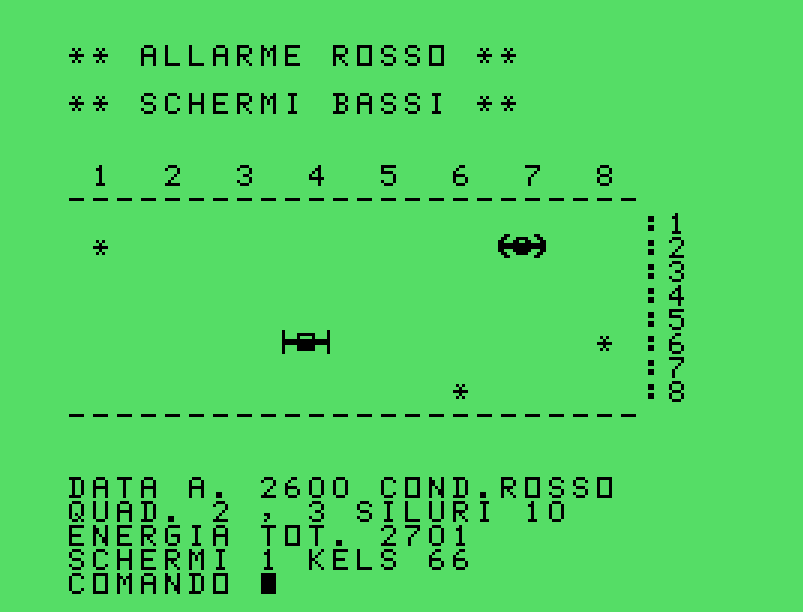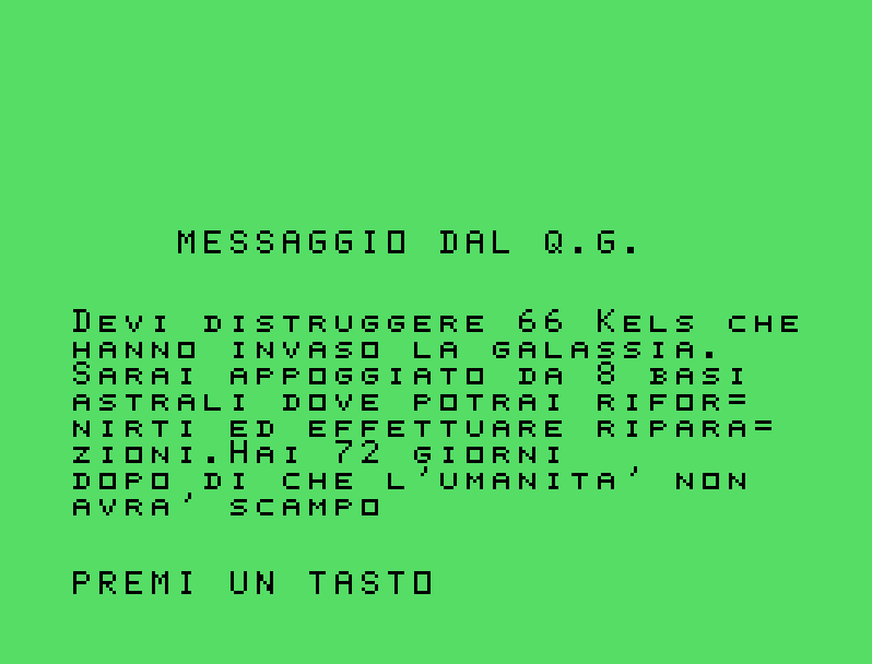 Una simulatione tattica di guerra spaziale che unisce logica, rischio calcolato e un pizzico di paranoia cosmica. Ideato da Paolo Tamburelli venne pubblicato nella rivista italiana TI99Newsoft di Ottobre/Novembre 1985. Sviluppato in TI-BASIC.