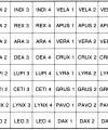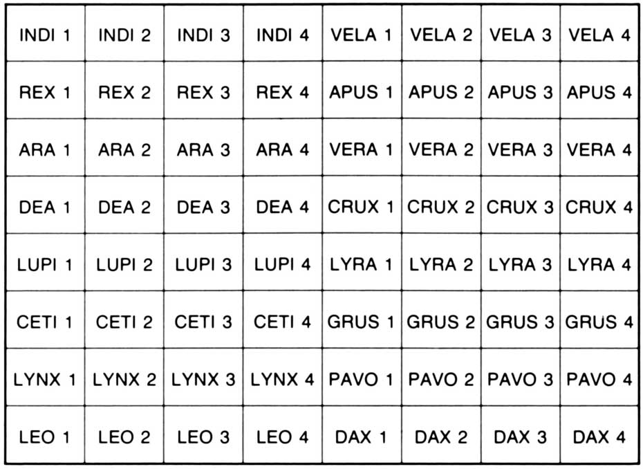 La mappa di gioco è una griglia 8x8 composta da 64 costellazioni, ciascuna identificata da un codice a quattro lettere e un numero (es. INDI 1