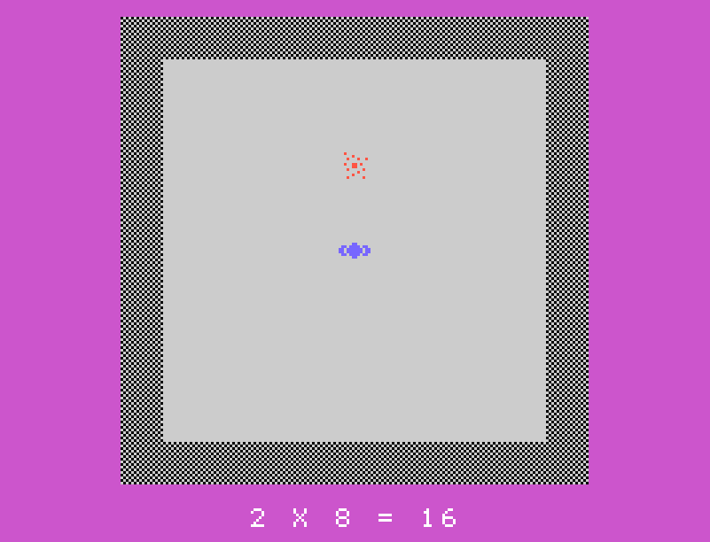 Abbiamo un gioco educativo originale che fonde azione, logica e didattica. E' pensato per i più piccoli per fare in modo che possano ripassare le moliplicazioni giocando, ma non manca di offrire una sfida avvincente anche agli adulti nei livelli più avanzati. Sviluppato in Extended BASIC dal talentuoso Raffaele 'Lello' Ferrigno venne pubblicato sulla cassetta allegata alla rivista italiana TI99Newsoft di Gennaio 1986.