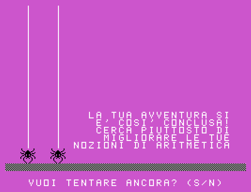 Una volta raggiunto il centro prima del ragno, il gioco proporrà un quesito aritmetico. Rispondere correttamente consentirà di eliminare il ragno e aprire le uscite della stanza, permettendo al giocatore di scegliere con calma la direzione da prendere per proseguire nel labirinto. Al contrario, vari errori nel dare la risposta o l’arrivo del ragno al centro prima del giocatore comporteranno la fine immediata della partita.