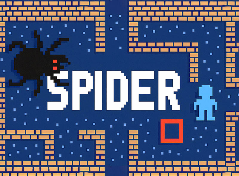 SPIDER si avvia con una schermata introduttiva e una sezione di istruzioni. Il movimento dell’omino blu avviene tramite i tasti direzionali ('E' freccia su, 'X' giù, 'S' sinistra, 'D' destra), in perfetto stile arcade. Il giocatore può scegliere il livello di difficoltà prima di iniziare, e modificarlo ad ogni nuova partita. In qualsiasi momento, è possibile interrompere il gioco premendo il tasto ' + '.