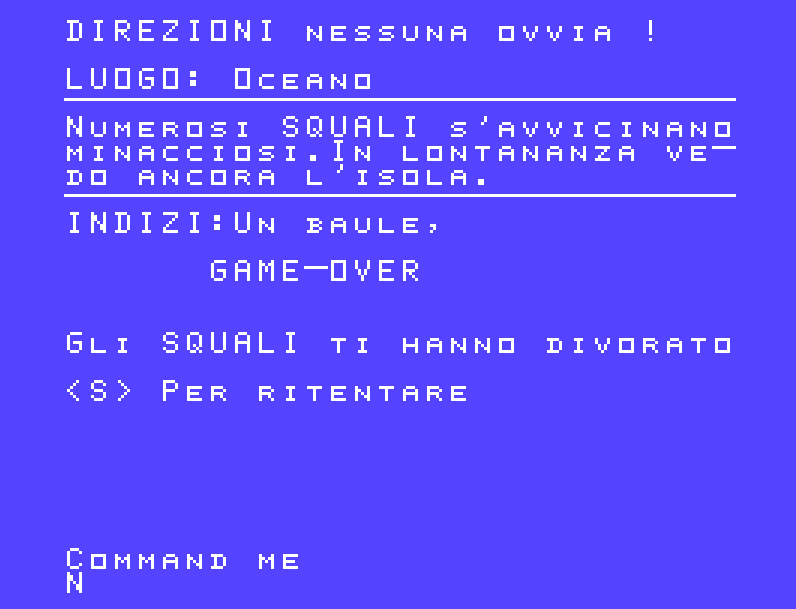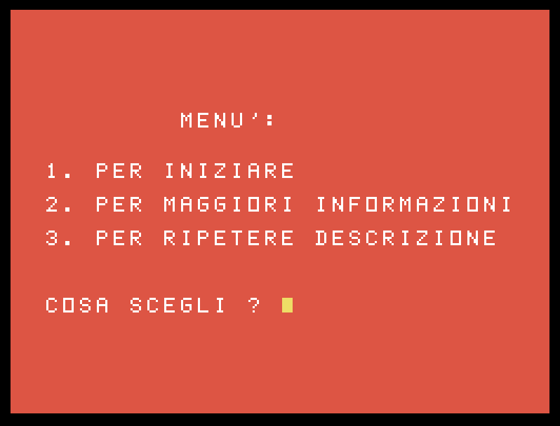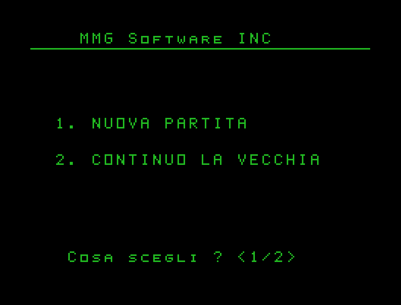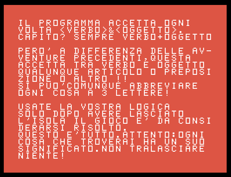 Dopo aver dato il RUN, prima di cominciare vi sarà chiesto se vorrete giocare una partita nuova, oppure no, in quest'ultimo caso dovrete caricare il "vecchio " file, per ristabilire la situazione in cui vi trovate quando é stato interrotto il gioco. E' altrettanto chiaro che in qualunque momento potrete salvare lo stato del gioco, con il comando SAVE GAME.