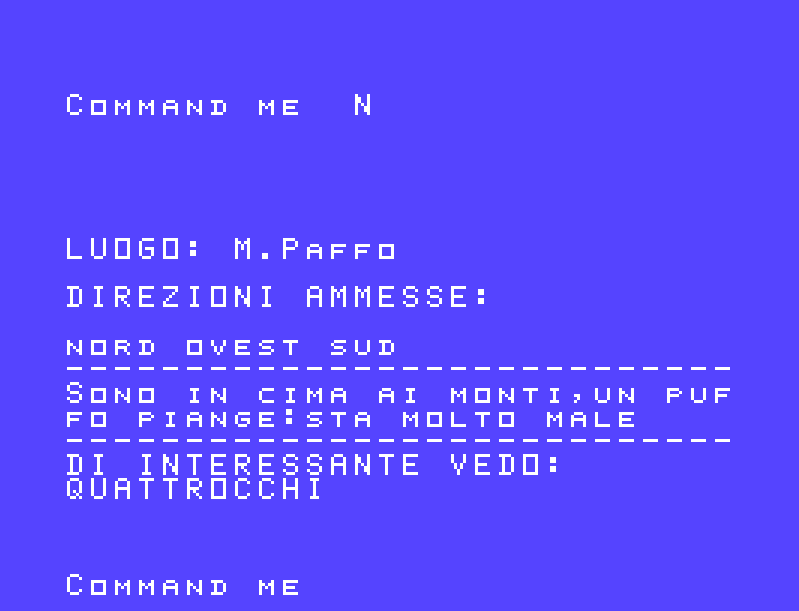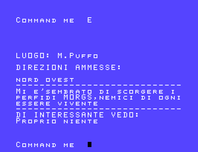 I comandi vanno digitati in forma sintetica come indicato, seguiti da oggetto (es. PREN SCAR ). Sempre abbreviate andranno indicate le direzioni, basterà digitare l'iniziale E, O, N, S |