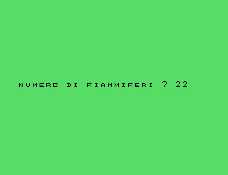 Dopo aver avviato il gioco con il fatidico "RUN", apparirà una schermata con le istruzioni preliminari che rimarrà giusto il tempo di essere letta. Il computer poi ci farà delle domande: la quantità di fiammiferi in gioco e chi sarà ad iniziare per primo.