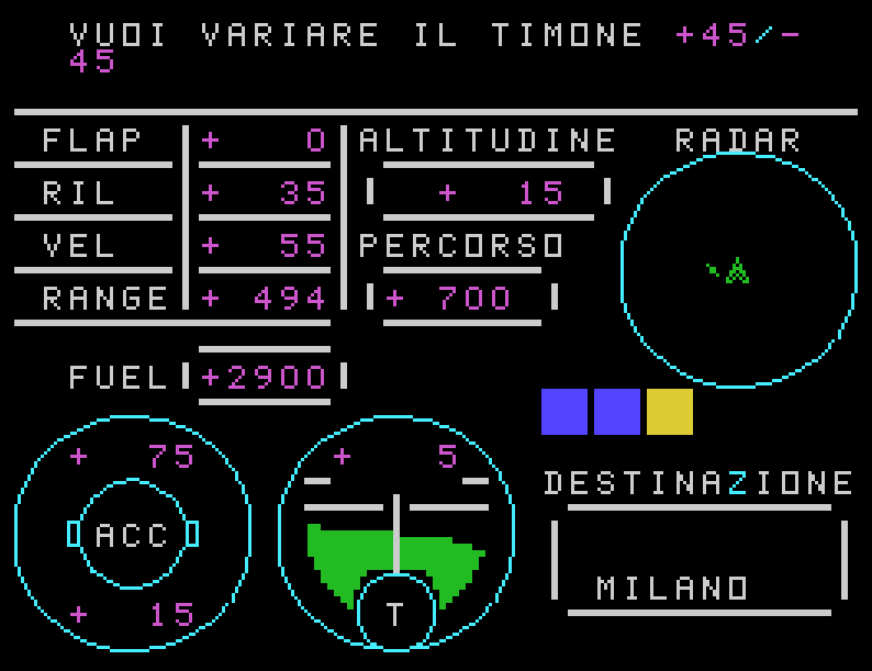 Il quadro FUEL segnala il carburante residuo. Quando la spia diventa rossa, siete in riserva: ogni miglio conta. Il quadro ACC mostra accelerazione e decelerazione, mentre il quadro T offre l’orizzonte e l’inclinazione del timone. Come per i flap, l’inclinazione può essere positiva o negativa. Il timone è essenziale per mantenere la rotta: a valore zero l’aereo viaggia diritto, altrimenti sterza di tre volte l’angolo impostato.