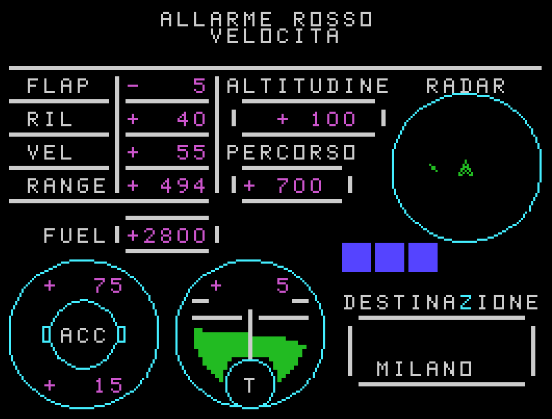 La parte superiore del cruscotto è dominata dal display del computer di bordo, che guida il giocatore passo dopo passo, chiedendo modifiche di volo o segnalando allarmi. Sotto il display, a sinistra, troviamo i FLAP, che indicano l’angolo di inclinazione dei timoni delle ali. Un’inclinazione negativa fa scendere l’aereo, una positiva lo fa salire. Ma attenzione: l’aereo reagisce con un angolo tre volte superiore a quello impostato. Per mantenere quota costante, il valore dei flap deve essere rigorosamente a zero